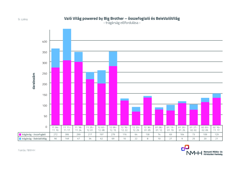 A médiahatóság közölte: bár a nemrég véget ért sorozatban az idő előrehaladtával az aggályos tartalmak előfordulása csökkent, a széria elején észlelt kimagasló számuk továbbra is aggodalomra ad okot, főleg annak tükrében, hogy a Való Világ kilencedik évadának nézettségi mutatói még mindig a 13 és 17 év közötti korosztályban a legmagasabbak.