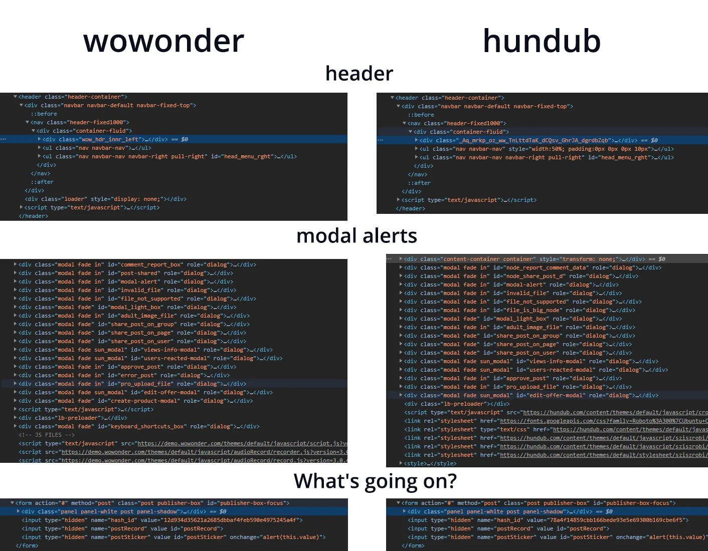 Több olvasónk és egy általunk megkérdezett informatikai szakértő is határozottan azt állítja, hogy a „magyar Facebookként” is emlegetett Hundub és a WoWonder kódjai jelentős mértékben hasonlítanak egymásra, néhány apróbb változtatást leszámítva sok kódsor megegyezik egymással. Márpedig utóbbi, a WoWonder egy olyan PHP-s kódokból összerakott programkód-csomag, ami lehetővé teszi, hogy bárki rövid időn belül elindíthassa saját közösségi médiás felületét. A WoWonder 3 féle csomagban is kínálja a social media programkódot: az alapcsomag 125 dollárba kerül, a legmagasabb szintű 399 dollárba, míg a közbülső csomag 170 dollárba. Le kell tölteni a WoWondert, és szinte azonnal már indulhat is a saját közösségi médiás felület, ha van ehhez egy szerver, amire fel lehet telepíteni.