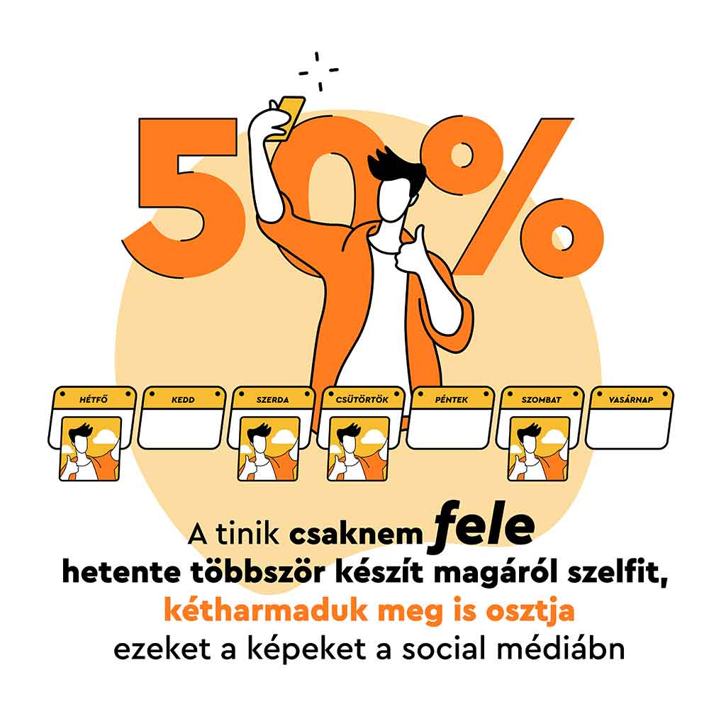 Ki ne látott volna már szelfiző fiatalokat? A megkérdezett tinik 53 százaléka hetente többször is készít magáról szelfit. Közülük minden negyedik rendszeresen meg is osztja ezeket a fotókat valamelyik közösségi média felületen.