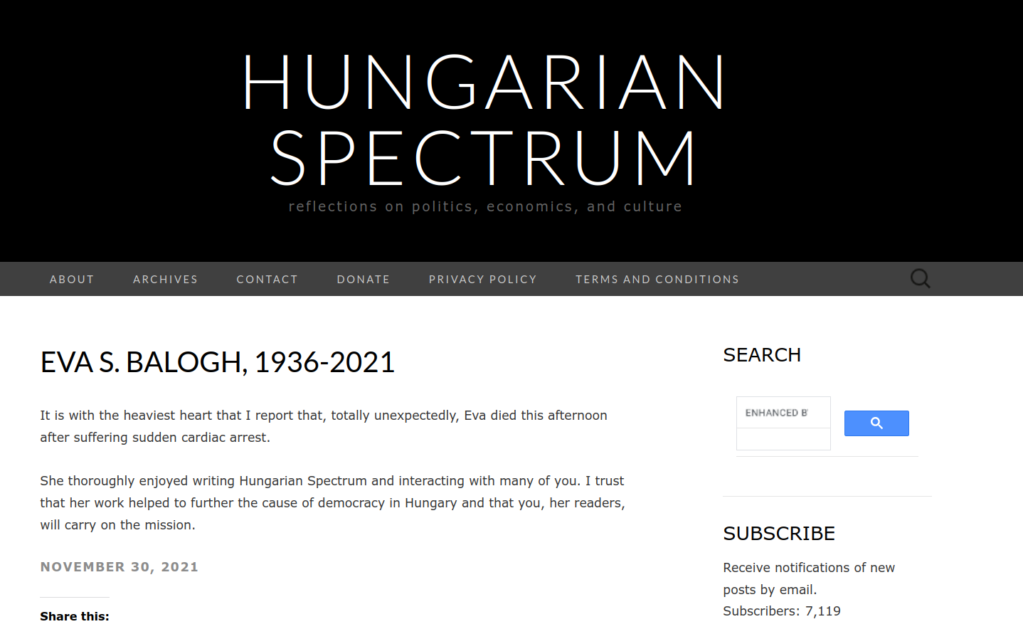 Balogh S. Éva halálhíréről a mostanáig általa szerkesztett, Magyarországról, kultúráról, politikáról, gazdaságról szóló angol nyelvű honlap, a Hungarian Spectrum számolt be.