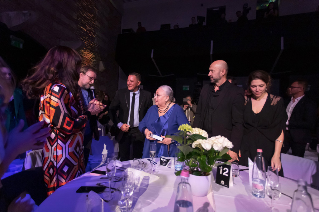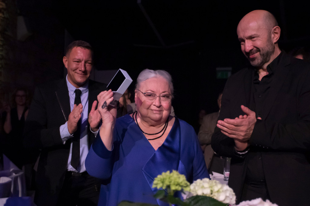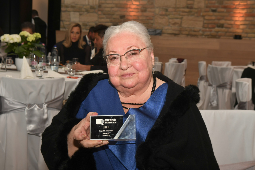 Molnár Piroska, a Keresztanyu főszereplője, a Nemzet Színésze a Televíziós Újságírók Díja Gálán 2022.03.23-án, kezéből a legjobb színésznőnek járó díjjal
