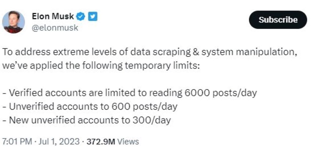 Az ellenőrzött fiókokat átmenetileg napi 6000 bejegyzés olvasására korlátozták, az ellenőrizetlen fiókok napi 600, az új ellenőrizetlen fiókok pedig csak napi 300 bejegyzés olvasására korlátozódnak – közölte Musk a Twitteren.
