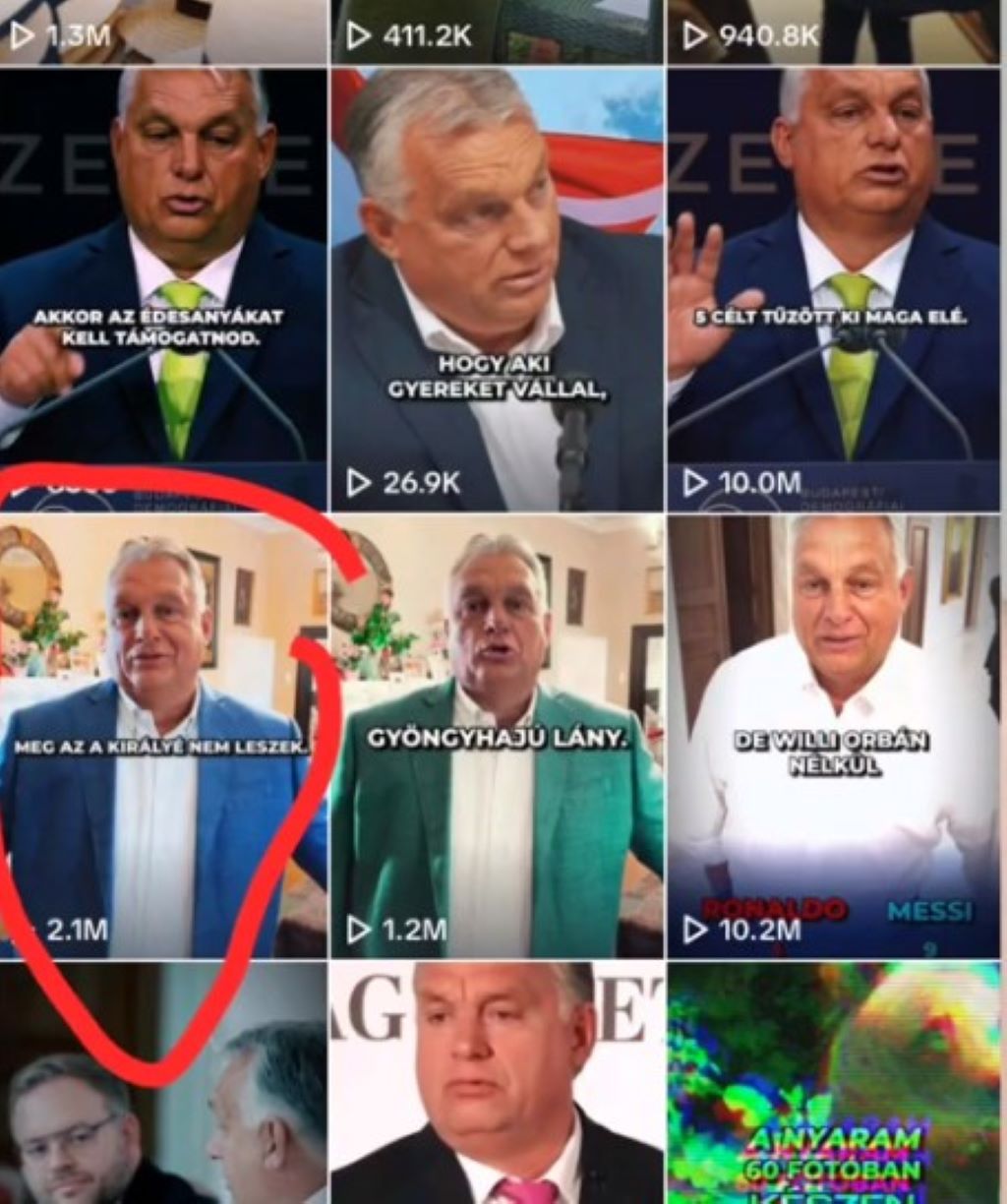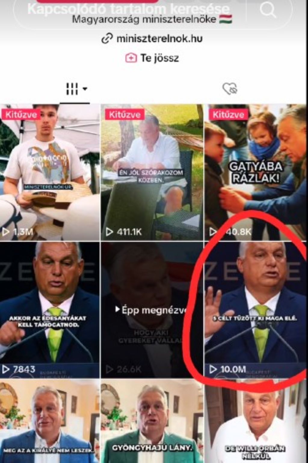 Az influenszer talált emellett olyan videót is a Viktor a TikTokon elnevezésű oldalon, amely 2 milliónál is nagyobb megtekintést produkált a kiírás szerint, de miután ezeket csütörtök reggel Tóth Bettina szóvá tette az Instagram-oldalán, estére ugyanennél az Orbán-videónál már csak alig százezres nézettség szerepelt. Péntek délutánra is csak a 128 ezret haladta meg a jelzett szám.