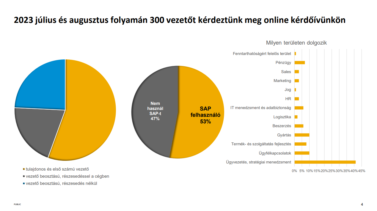 A kerekasztal beszélgetést követően Pintér Szabolcs (SAP Hungary) sajtótájékoztatót tartott a cég SurvAI elnevezésű kutatásáról. A felmérés célja az volt, hogy megmutassa, a vállalatok miként viszonyulnak a mesterséges intelligenciához, milyen területeken számítanak AI-indukálta változásra, erre milyen eszközökkel készülnek, valamint függ-e a hozzáállásuk a cégük méretétől, az iparágtól vagy a digitalizáltság fokától. Noha a kutatás nem tekinthető reprezentatívnak, a csaknem 300 cégtulajdonossal, felsővezetővel készült kutatásban a magyar gazdaság viszonylag széles spektruma képviseltette magát, vállalatméret szempontjából arányos eloszlásban.