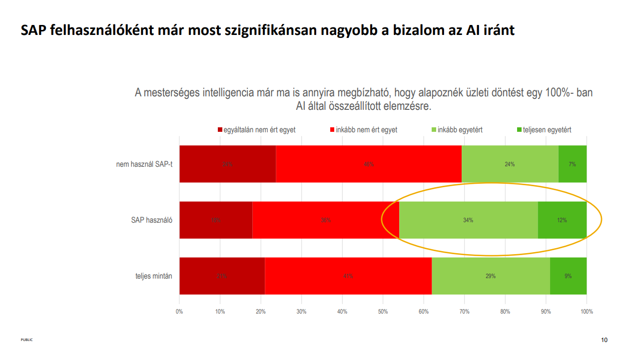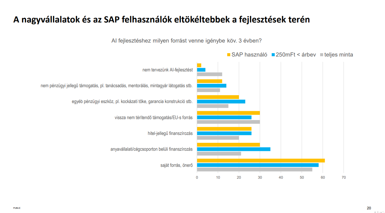 A kutatás a forrás és a tudás kérdéskörére is kiterjedt. A válaszadók többsége túlnyomórészben saját forrásaira számít (55%) a jövőbeni MI-fejlesztések finanszírozására, de külső forrásként hitelt (20%) vagy uniós pénzt (30%) is megjelöltek. Azt is megmutatta a felmérés, hogy az SAP felhasználók tudatosabban állnak a mesterséges intelligenciához: körükben 80 százalék körüli azok aránya, akik lehetőséget látnak, és valódi árbevételi hatást is remélnek az MI használatától.