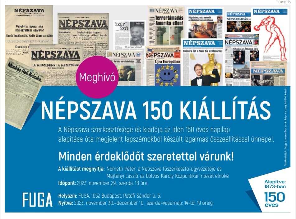 A Fuga Építészeti Központban szerdán nyíló kiállítás ezzel a címlappal indít, majd végigvisz a történelem kiemelt pillanatain, emlékezve például Somogyi Béla, a lap felelős szerkesztőjének meggyilkolására, de címlapon hozta a Népszava 1937. október 29-én a nagy hírt, hogy „Nobel Díjat kapott Szent-Györgyi Albert tanár”. Ott van a kiállított tablók között továbbá 1941. december 25-én megjelent híres karácsonyi, az antifasiszta nemzeti összefogás és függetlenségi mozgalom gondolatának szentelt szám. És megannyi fontos történelmi, nemzetközi és hazai vonatkozású pillanat: a londoni 6:3, az Apollo–11 űrutazása, az első magyar Oscar-díj, Göncz Árpád köztársasági elnökké választása, 9.11. vagy Kertész Imre Nobel-díja is. És ott van a legközelebbi múlt is néhány címlapon, és felvillan a digitális jelen… jövő.