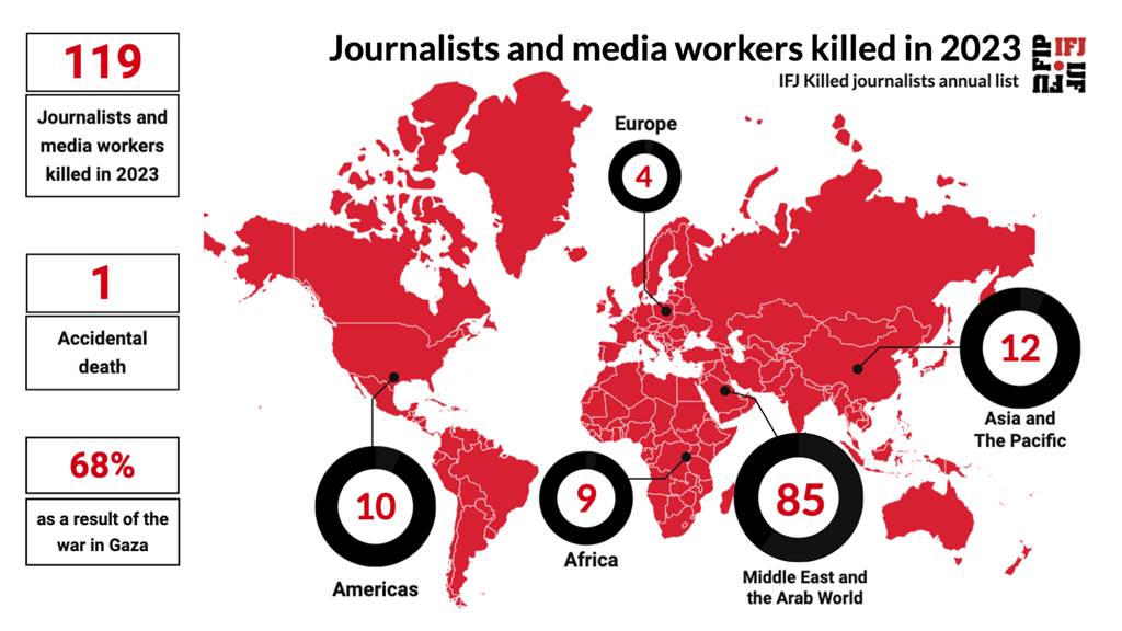 2023-ban összesen 120 újságírót és médiamunkást öltek meg az International Federation of Journalists (IFJ) december 31-án közzétett jelentése szerint. Egy december 8-i jelentés még 94 gyilkosságra vonatkozó adatot tartalmazott, de azóta – főleg a gázai övezetben – még többen elestek.