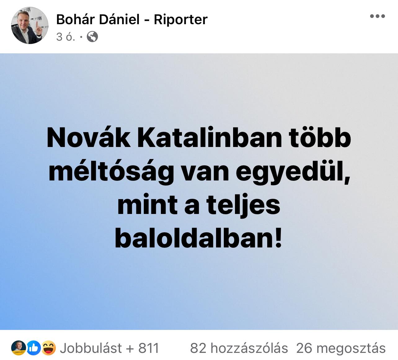 A Novák Katalin lemondásáról szóló tévébeszéd után Bohár Dániel ezt írta ki Facebookon: