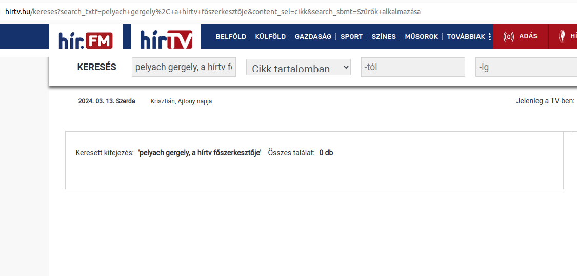 A „HírTV főszerkesztője” kifejezésre csak olyan, tavalyi tartalmak jelennek meg, amelyekben Velkovics Vilmos neve szerepel, Pelyach Gergelyt nem hozza ki az oldal.