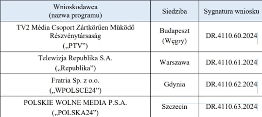 A négy induló, köztük a TV2 Média Csoport Zrt. a lengyel frekvenciapályázaton