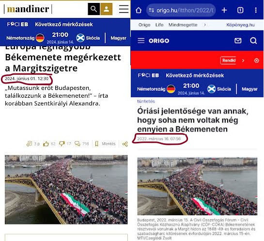 Borító: A Mandiner egy 2022-es fotóval illusztrálta a 2024-es Békemenetet, az Origo archív cikke buktatta le őket, Képernyőképek: Mandiner, Origo