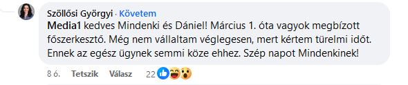 „@Media1, kedves Mindenki és Dániel! Március 1. óta vagyok megbízott főszerkesztő. Még nem vállaltam véglegesen, mert kértem türelmi időt. Ennek az egész ügynek semmi köze ehhez. Szép napot Mindenkinek!”