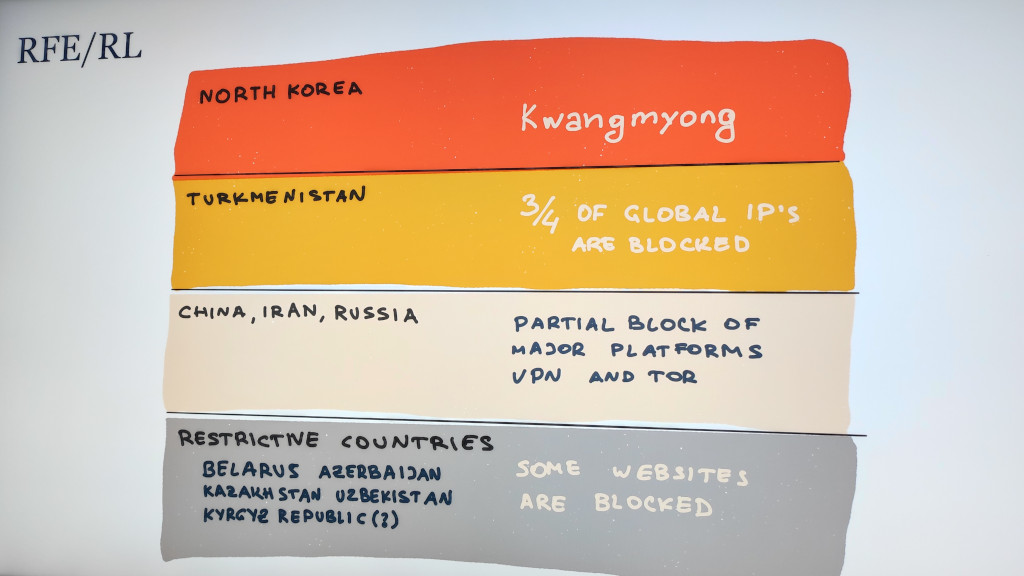Jellemző a konferencia hangulatára, hogy az egyik kísérő workshop az internetes cenzúrával foglalkozott. Megmutaták, hogy milyen módszerekkel tarta távol a kormány a lakosságot Észak-Koreában a Kwangmyong rendszer segítségével az internet színe-javától. Türkmenisztánban a globális IP címek több mint háromnegyedét blokkolják. Kínában, Iránban és Oroszországban a főbb platformokat blokkolják, ahogy a VPN szolgáltatásokat (virtuális magánhálózat) és a TOR-t is. Azerbajdzsánban, Fehéroroszországban, Kazahsztánban, Üzbekisztánban, Kirgizisztánban szintén jelen van az internetcenzúra: egyes weboldalakat blokkolnak a lakosság számára.