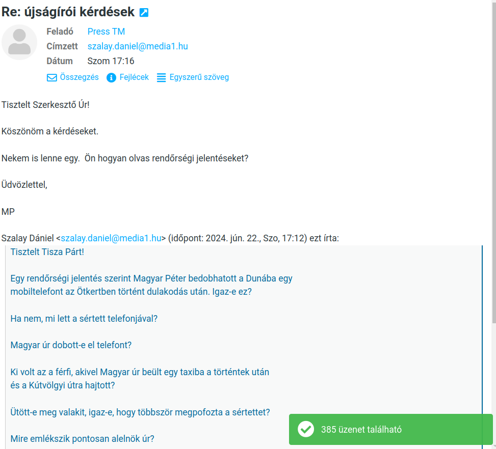 Ilyen előzmények után küldött a Media1 újabb kérdéseket szombaton 17:12-kor a Tisza Párt sajtóirodájának: