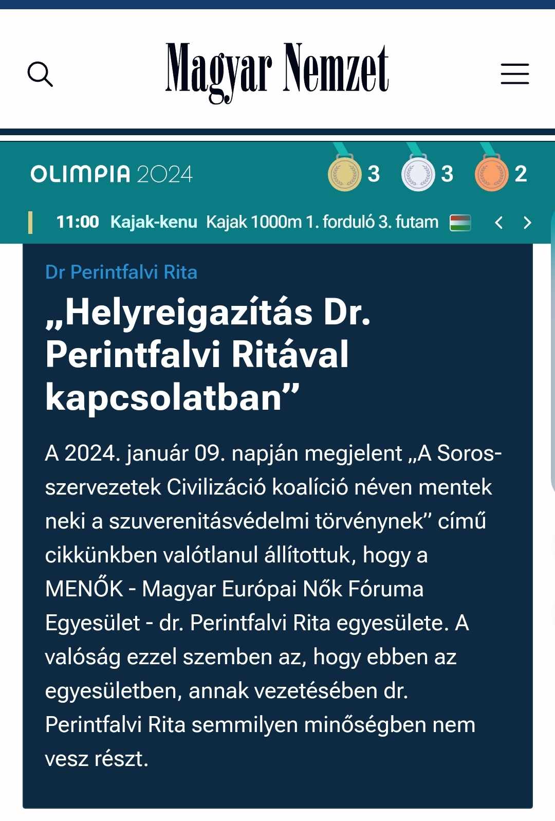 A lap közleményében azt írja, hogy a 2024. január 9-én megjelent „A Soros-szervezetek Civilizáció koalíció néven mentek neki a szuverenitásvédelmi törvénynek” című cikke valótlanul állította azt, hogy a MENŐK (Magyar Európai Nők Fóruma Egyesület) dr. Perintfalvi Rita egyesülete. A valóság ezzel szemben az, hogy az egyesületben, annak vezetésében dr. Perintfalvi Rita semmilyen minőségben nem vesz részt.