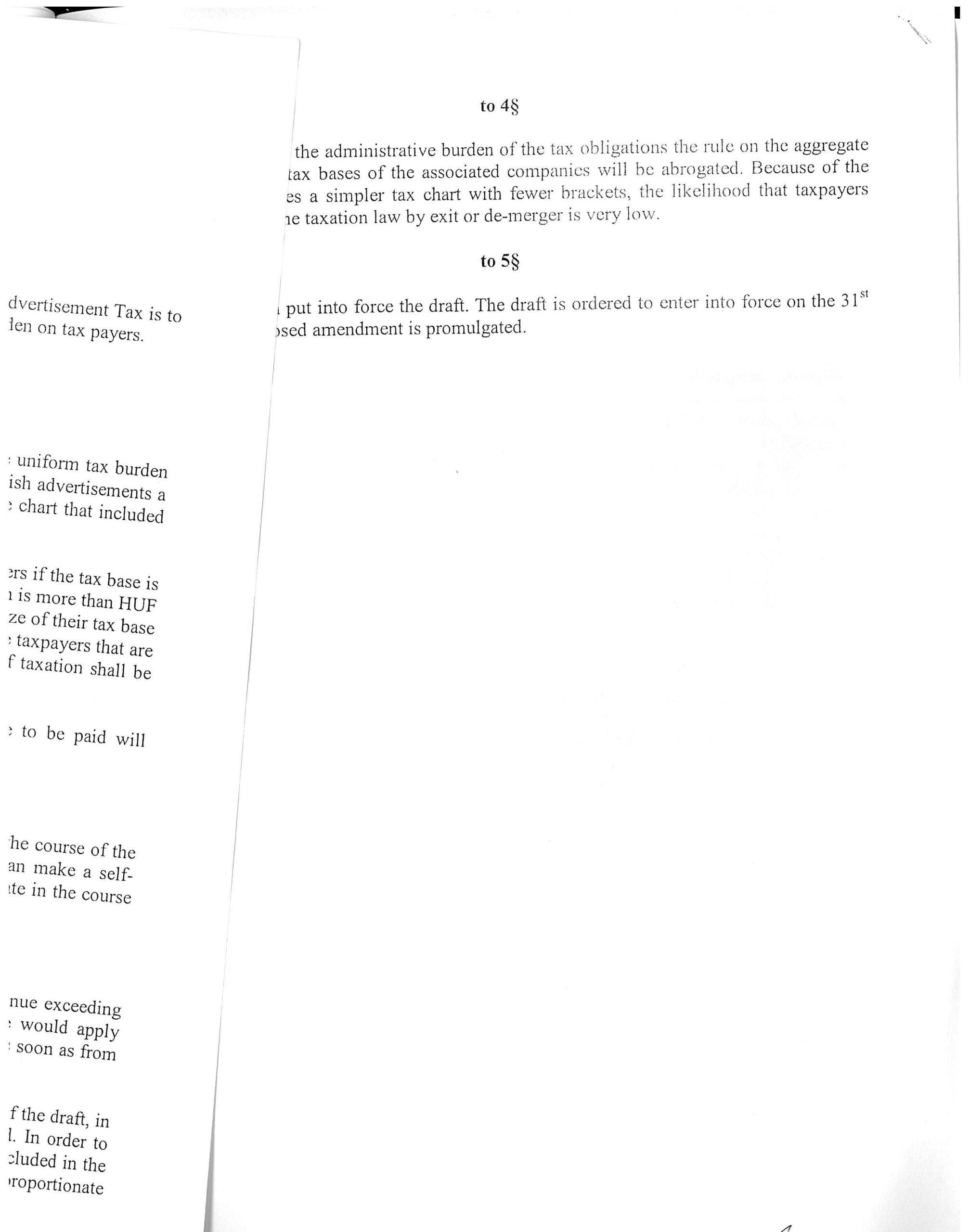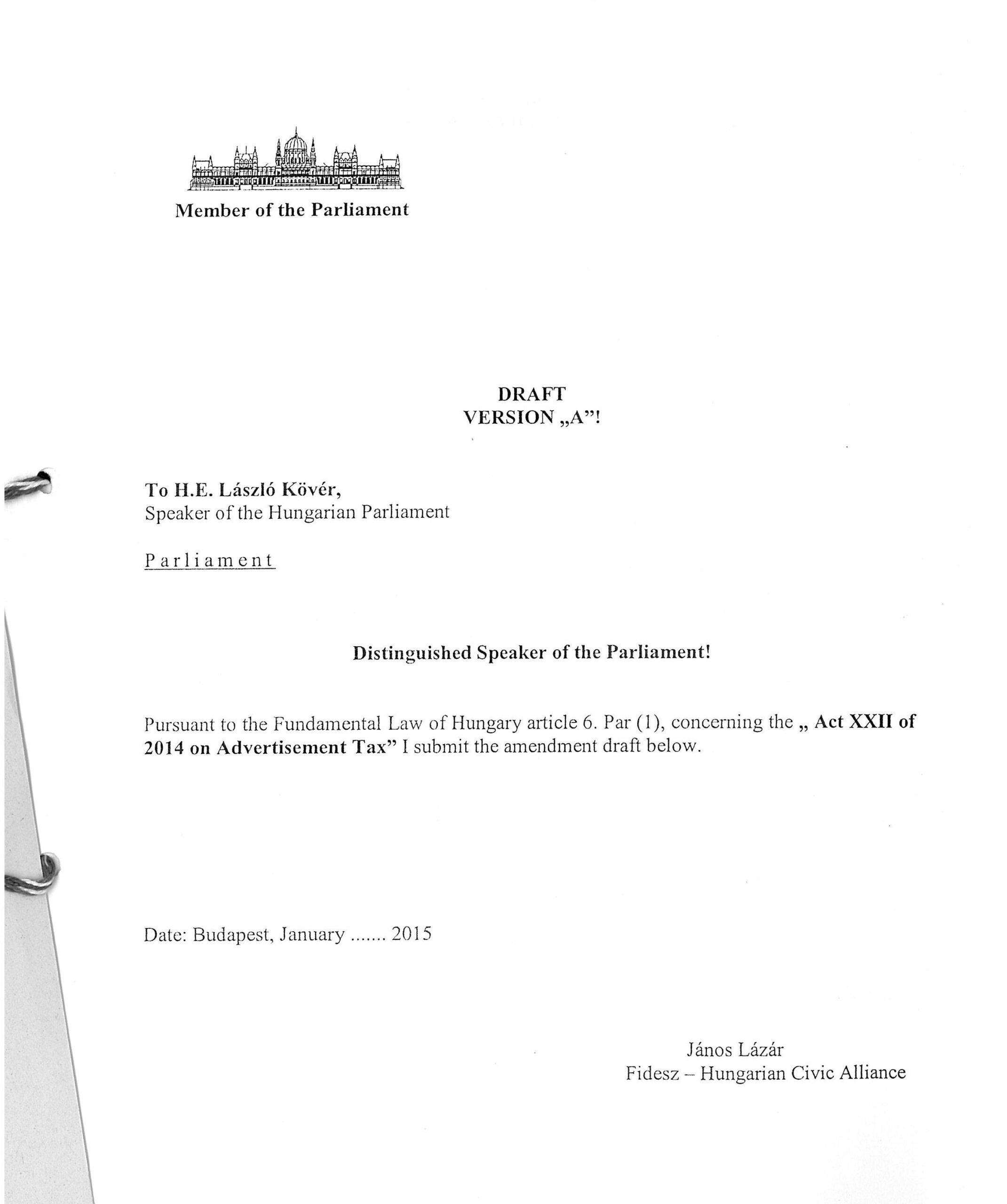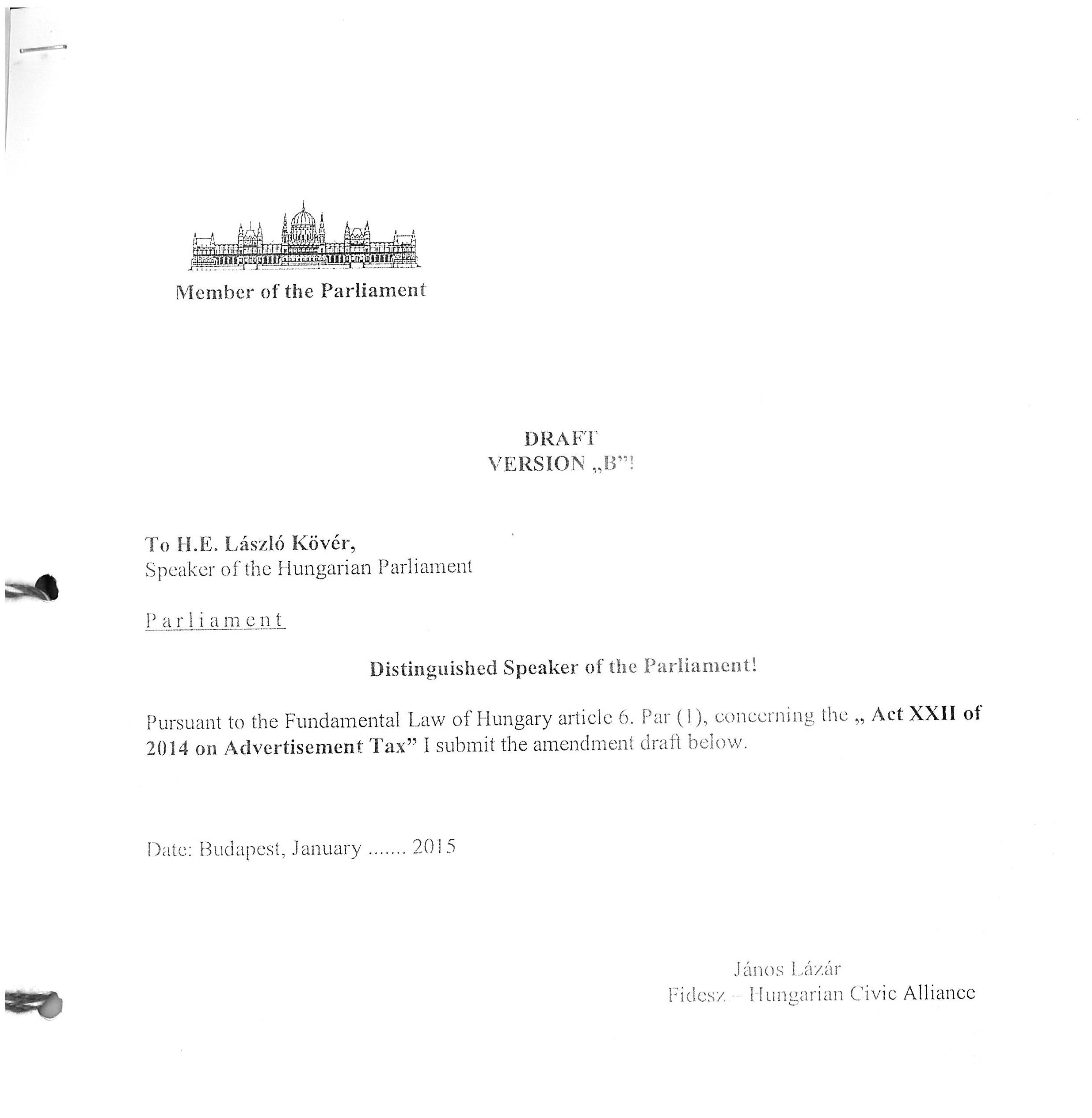Az RTL-nek egyébként már 2014 decemberében a törvénytervezet akkori változatai angol nyelvű fordításban is rendelkezésre álltak A és B verzióban egyaránt – ezt a 2015. január 29-én magyarországi közjegyzői hitelesítéssel ellátott, a Media1 birtokában lévő dokumentumok, e-mailes bizonyítékok is igazolják. Vagyis előbb került közjegyzői hitelesítés alá a reklámtörvény módosításának tervezete, minthogy az Országgyűlés elnökéhez L. Simon László fideszes képviselői egyéni képviselői indítványként benyújtotta volna a törvényjavaslatot. Íme.