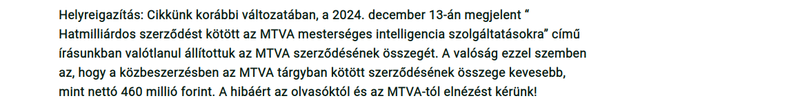 A címet egyébként feltételes módba írták át és a Kontroll oldalán az alábbi helyreigazítást tették közzé: „Helyreigazítás: Cikkünk korábbi változatában, a 2024. december 13-án megjelent »Hatmilliárdos szerződést kötött az MTVA mesterséges intelligencia szolgáltatásokra« című írásunkban valótlanul állítottuk az MTVA szerződésének összegét. A valóság ezzel szemben az, hogy a közbeszerzésben az MTVA tárgyban kötött szerződésének összege kevesebb mint nettó 460 millió forint. A hibáért az olvasóktól és az MTVA-tól elnézést kérünk!”