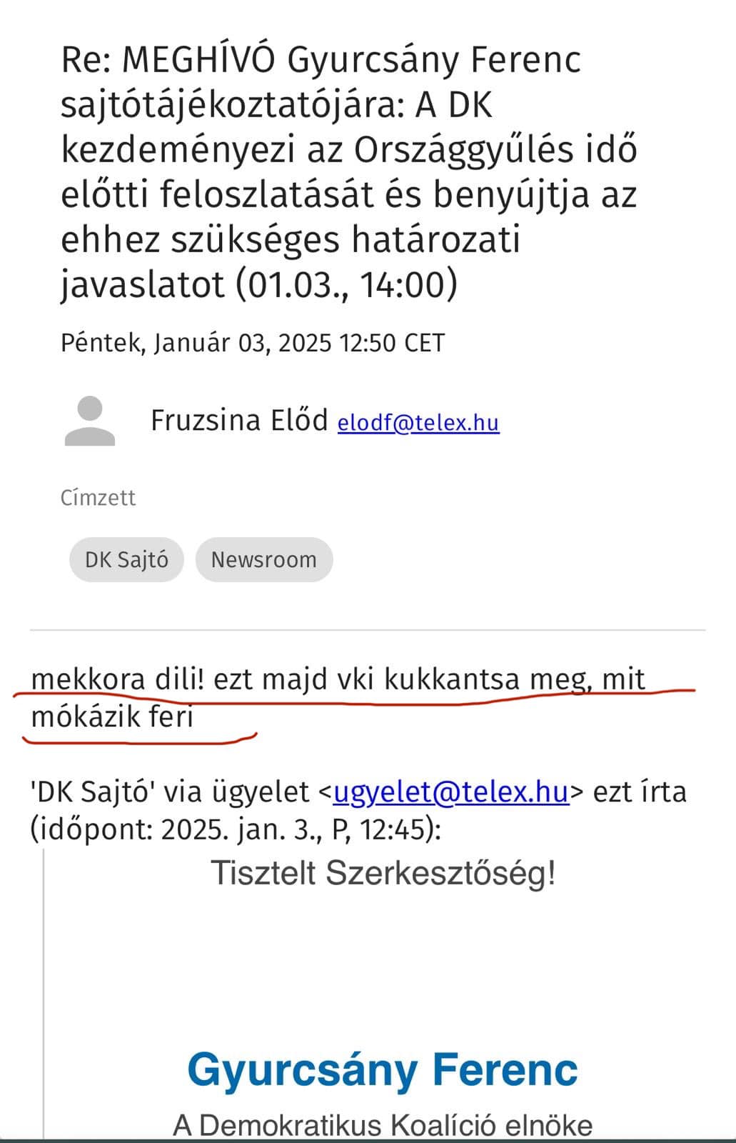 Előd Fruzsina, a Telex munkatársa – vélhetően tévesen – a Gyurcsány Ferenc vezette Demokratikus Koalíció sajtóirodájának küldött el a minap egy olyan e-mailt, amelyben ő maga „dilinek” és „mókának” minősíti a DK határozati javaslatát a Parlament feloszlatásáról és új választások kiírásáról, a volt miniszterelnököt pedig kis betűvel, „feriként” emlegeti. A párt vezetője nyilvánosságra hozta az e-mailt, mivel szerinte annak tartalma bizonyítja, hogy a lap tisztessége félrement.