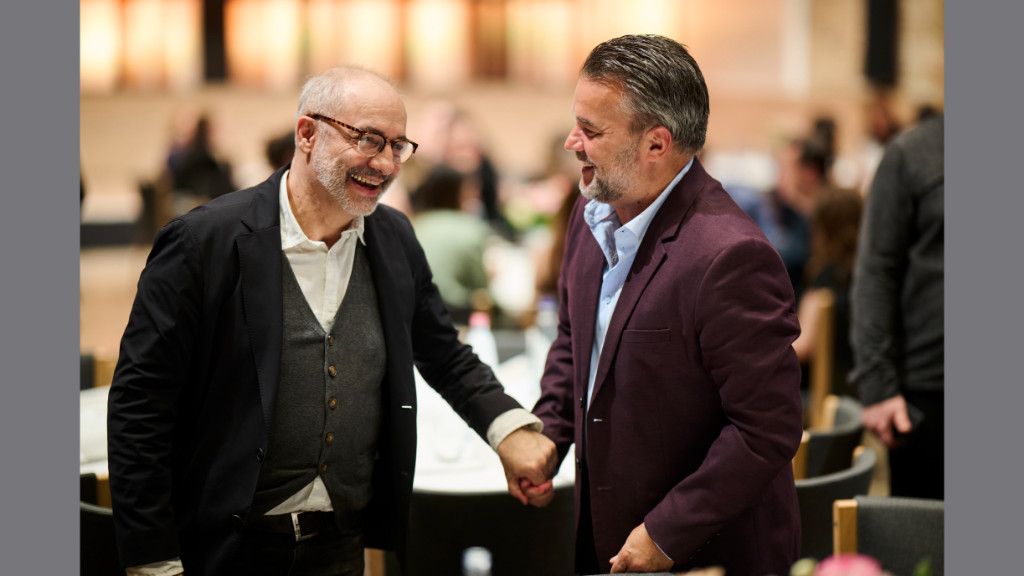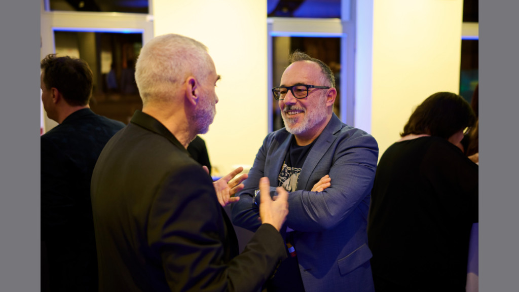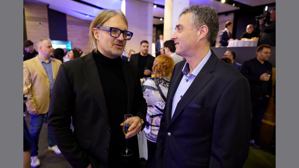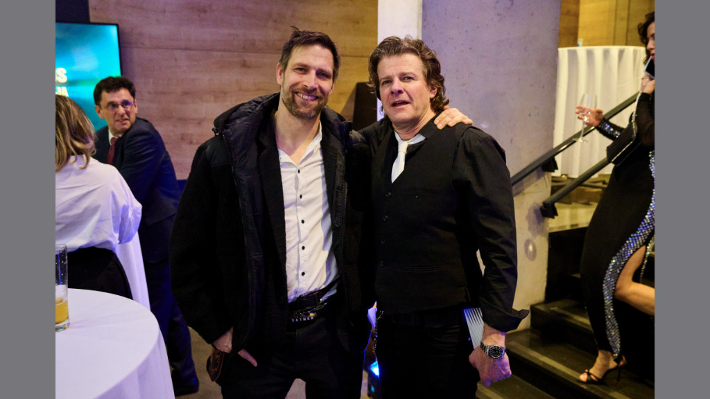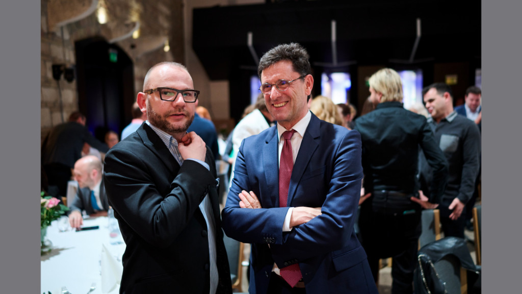 Kolosi Péter, az RTL Magyarország vezérigazgató-helyettese és Majoros Péter, Majka a Televíziós Újságírók Díja Gálán 2025.03.26-án
