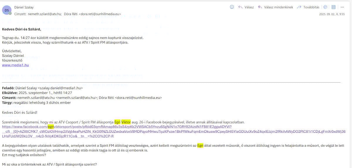 A Media1 egyébként még tavaly szeptember elején kétszer is megkereste az ATV-t sajtóosztályát és magát Németh S. Szilárd vezérigazgatót is Egri Viktor őszi Facebook-posztjával összefüggésben kérdésekkel, hogy megismerhessük a médiacsoport álláspontját is, mielőtt a bejegyzésekről beszámolunk.