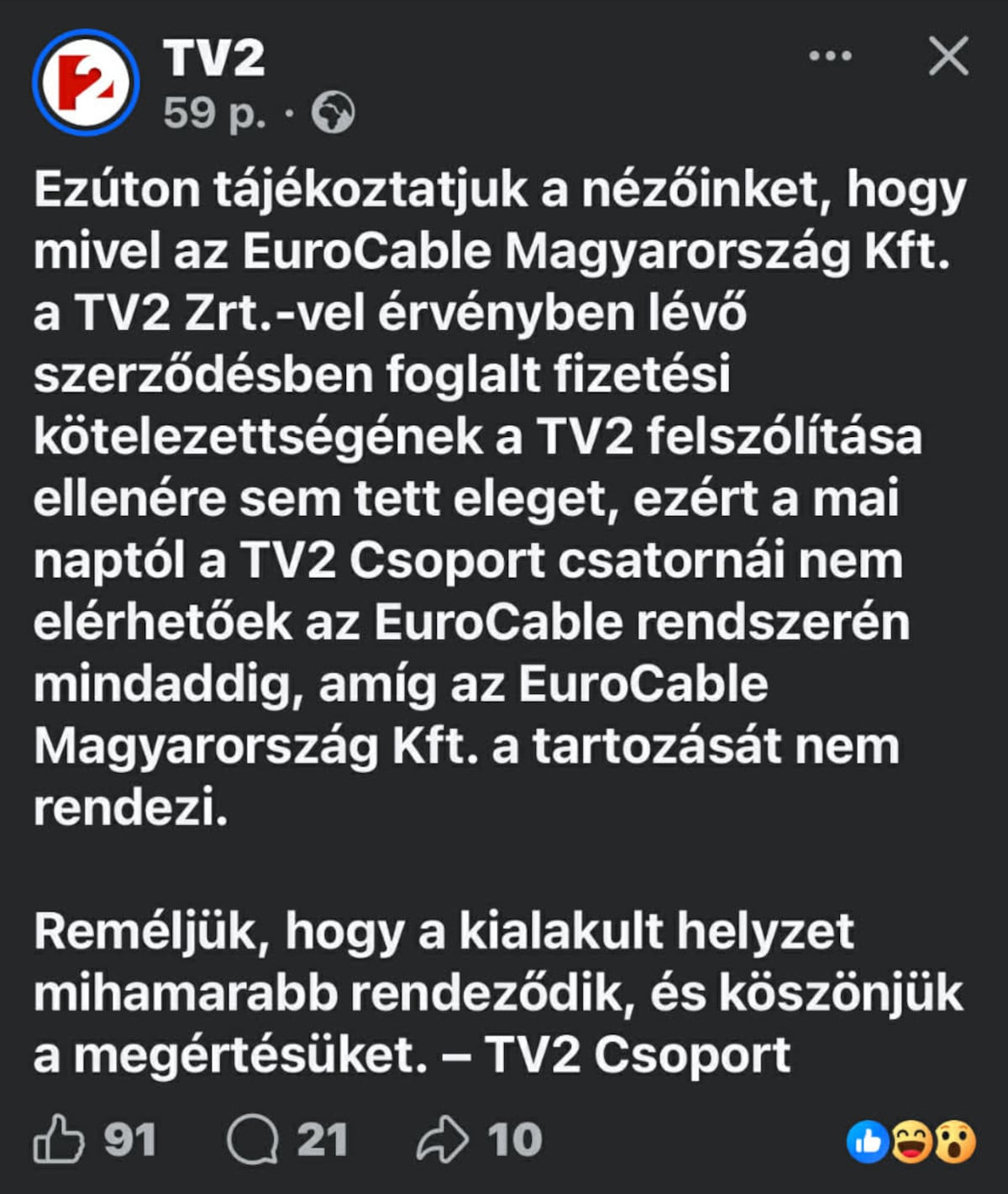 „Ezúton tájékoztatjuk a nézőinket, hogy mivel az EuroCable Magyarország Kft. a TV2 Zrt.-vel érvényben lévő szerződésben foglalt fizetési kötelezettségének a TV2 felszólítása ellenére sem tett eleget, ezért a mai naptól a TV2 Csoport csatornái nem elérhetőek az EuroCable rendszerén mindaddig, amíg az EuroCable Magyarország Kft. a tartozását nem rendezi. Reméljük, hogy a kialakult helyzet mihamarabb rendeződik, és köszönjük a megértésüket. – TV2 Csoport”