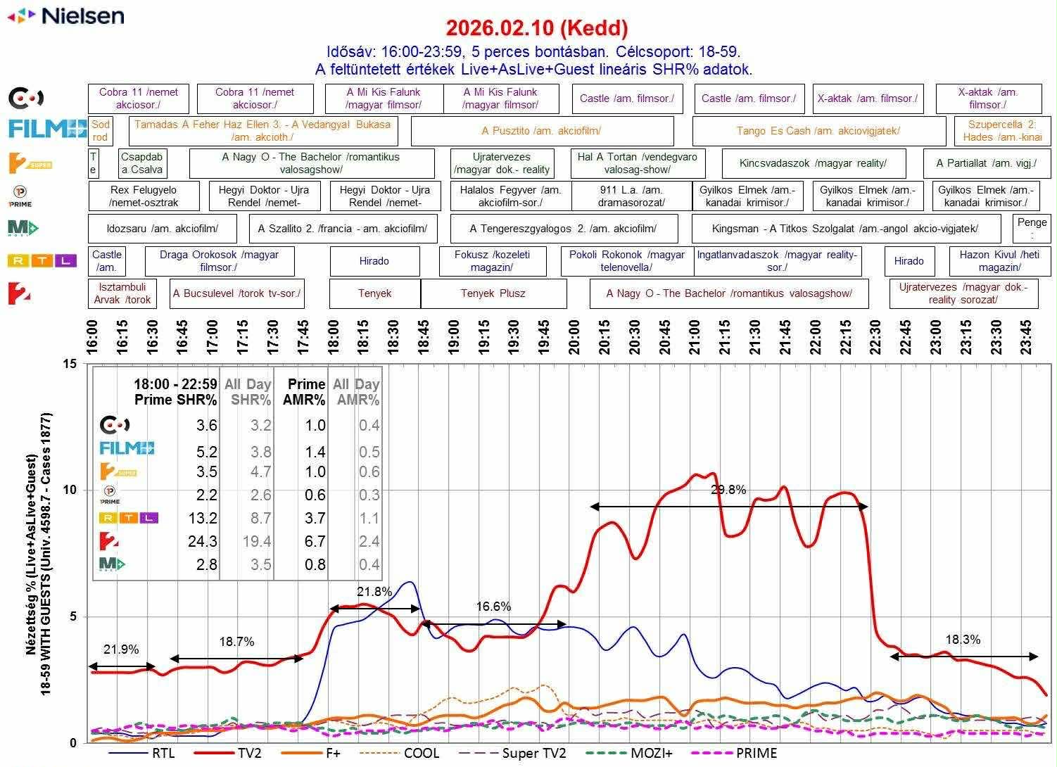 A televíziós szakmában és a reklámiparban etalonként figyelt Nielsen Közönségmérés adatai szerint a műsor utolsó hetében a TV2 22,2%-os főműsoridős átlagos közönségarányt ért el a 18–59-es korcsoportban, míg az RTL 12,5%-ot. Ekkora heti különbségre 2001 óta nem volt példa a két kereskedelmi csatorna között.