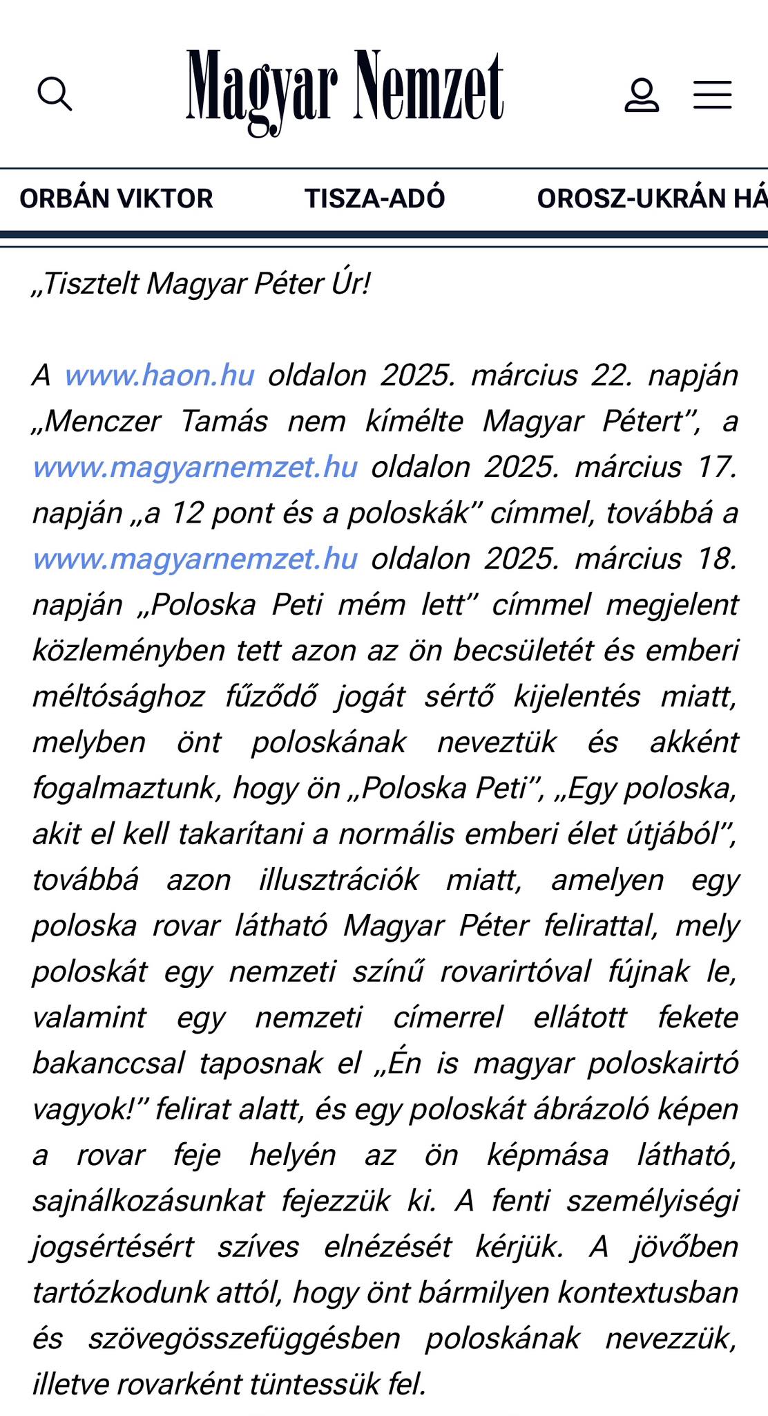 A www.haon.hu oldalon 2025. március 22. napján „Menczer Tamás nem kímélte Magyar Pétert”, a www.magyarnemzet.hu oldalon 2025. március 17. napján „a 12 pont és a poloskák” címmel, továbbá a www.magyarnemzet.hu oldalon 2025. március 18. napján „Poloska Peti mém lett” címmel megjelent közleményben tett azon az ön becsületét és emberi méltósághoz fűződő jogát sértő kijelentés miatt, melyben önt poloskának neveztük és akként fogalmaztunk, hogy ön „Poloska Peti”, „Egy poloska, akit el kell takarítani a normális emberi élet útjából”, továbbá azon illusztrációk miatt, amelyen egy poloska rovar látható Magyar Péter felirattal, mely poloskát egy nemzeti színű rovarirtóval fújnak le, valamint egy nemzeti címerrel ellátott fekete bakanccsal taposnak el „Én is magyar poloskairtó vagyok!” felirat alatt, és egy poloskát ábrázoló képen a rovar feje helyén az ön képmása látható, sajnálkozásunkat fejezzük ki. A fenti személyiségi jogsértésért szíves elnézését kérjük. A jövőben tartózkodunk attól, hogy önt bármilyen kontextusban és szövegösszefüggésben poloskának nevezzük, illetve rovarként tüntessük fel.